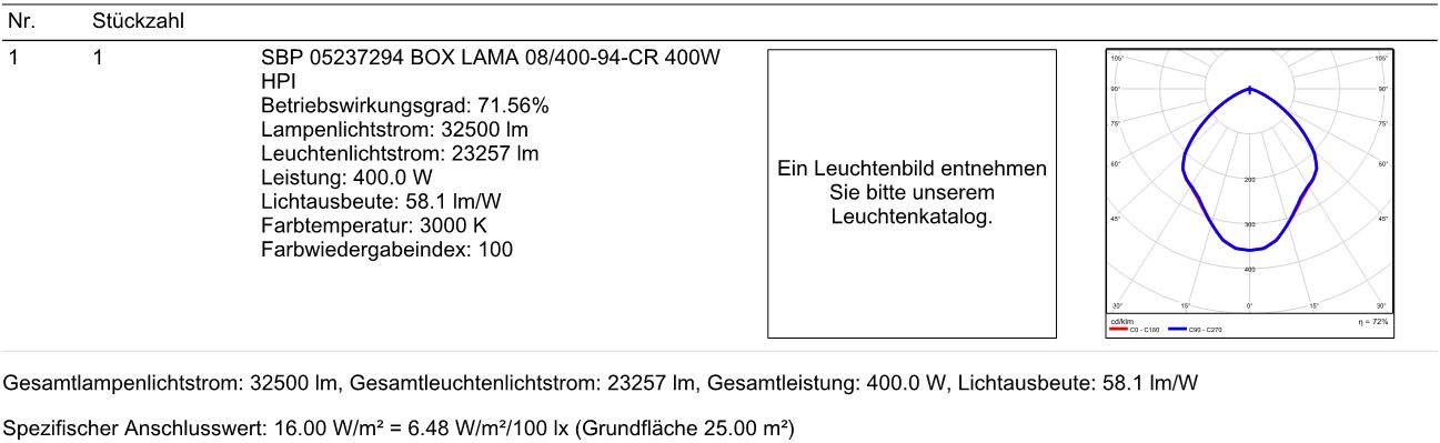 | Diese Lichtberechnung stellt den direkten Vergleich zwischen 400W HQI (links) und 150W LED (rechts) dar.Bei diesem Vergleich ist deutlich zu erkennen, dass trotz des geringeren Lichtaustritts der Leuchten mit LED-Technik gegenüber der HQI-Leuchte eine höhere Lichtstärke sowie eine bessere Lichtverteilung durch die LED bei einem Drittel der Leistungsaufnahme erreicht wird, dieser Vorteil der LED-Technik basierte auf der gerichteten Lichtabstrahlung der LED.Durch diesen Umstand ergibt sich bei einem „Ein-Schicht-Betrieb“ (2.750 h/a) eine CO² Einsparung von 580 kg/a pro Leuchte sowie 0,10 € bei 0,226 €/KWh pro Leuchtstunde einer Leuchte. | |